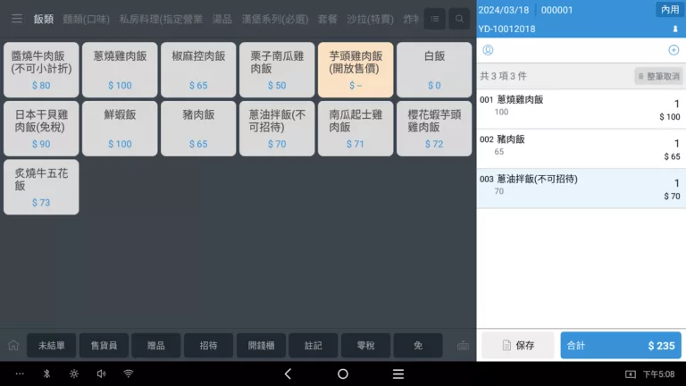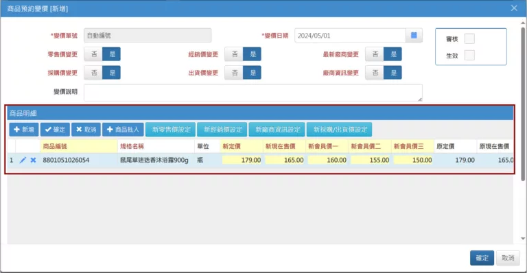 - 開放售價旗標:若選擇「自動開放售價」則該餐點價格在POS上會變成「–」,即須手動輸入金額。適合價格不固定或秤斤秤兩、時價的餐點。