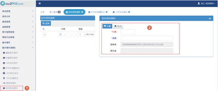 點選左側選單基本資料–>【餐點管理】–>輸入欄位1.區塊內容。