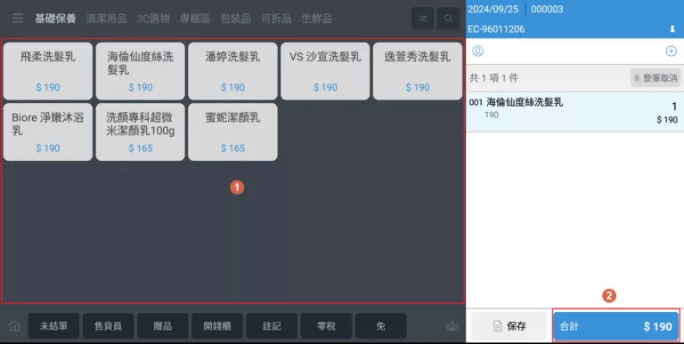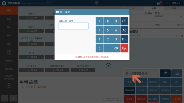 - 條碼:若有販賣其他商品,且有國際條碼(或自印條碼)可填入條碼數字,即可以掃瞄結帳。若無, 系統則會帶入餐點編號。