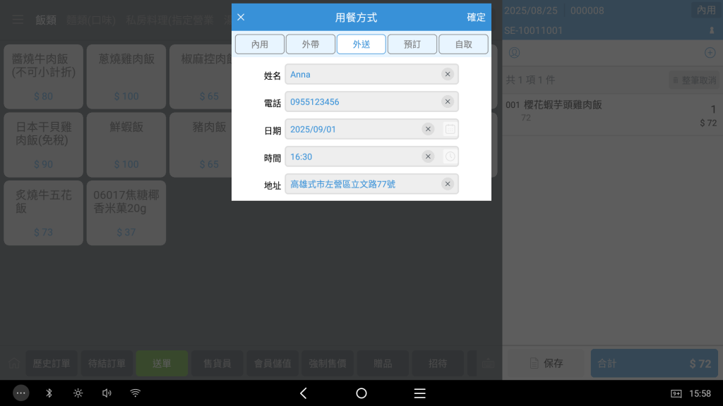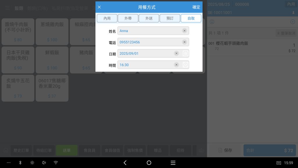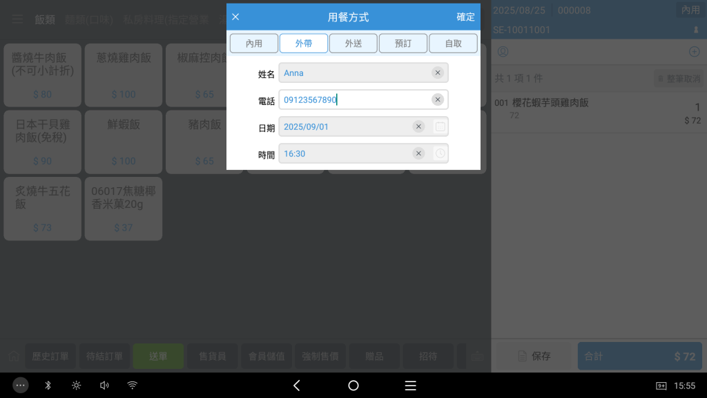 店家可以依據消費者點餐的取餐方式來記錄訂單的類型,當收據列印格式有設定時,也會把此資訊印在收據上用以辨認核對。